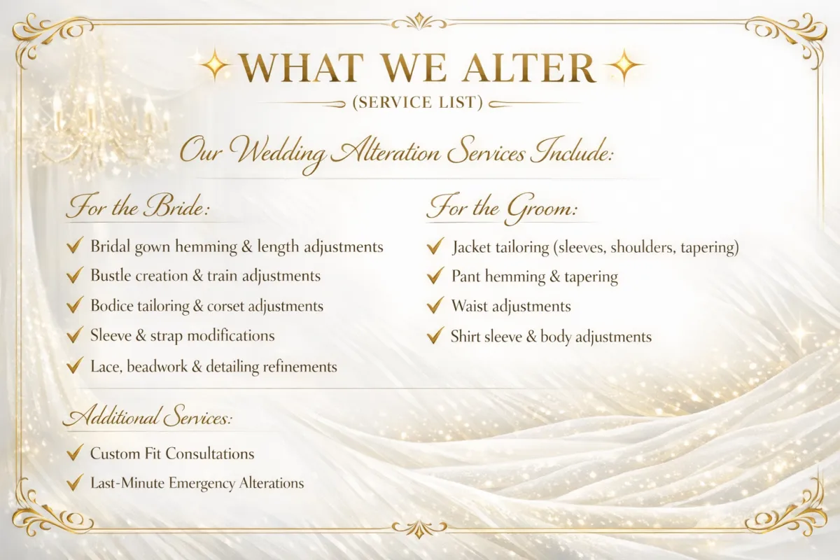 Our team works with precision, care, and a deep understanding of bridal and formal fashion to ensure your look complements the elegance of your celebration.